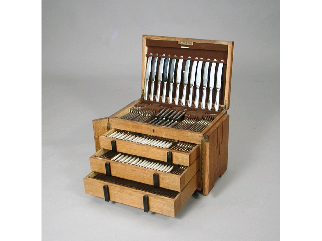 A plated canteen in a fitted, three drawer oak cabinet with a lift up cover: 12 tableknives, 12 side knives, 12 tableforks, 12 dessert forks, 12 soup spoons, 4 tablespoons, 12 dessert spoons, 12 teaspoons, 12 coffee spoons, 12 pairs of fruit knives and forks with mother of pearl handles, 12 pairs of fish knives and forks with mother of pearl handles, 2 sauce ladles, a three piece carving set and 8 condiment spoons.