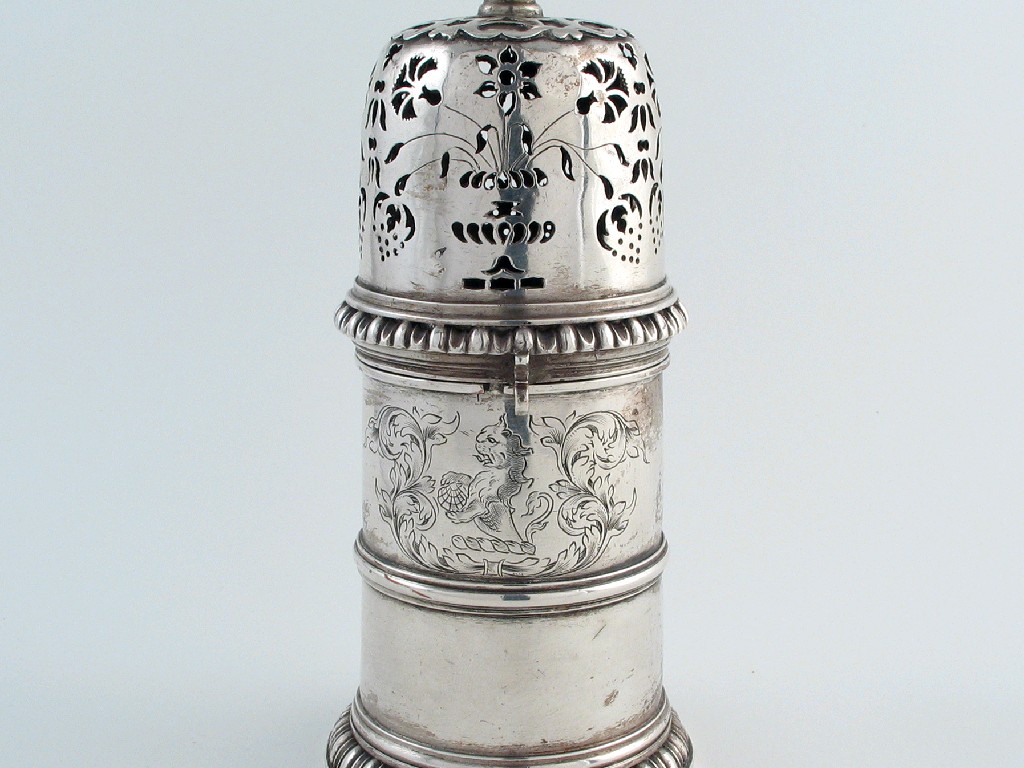 A 19th century electrotyped copper reproduction of a William and Mary lighthouse caster , the turned finial above a cut card top over a pierced design of vases of flowers, with heavy gadrooned borders, crested, 6.1in (15.5cm) high.