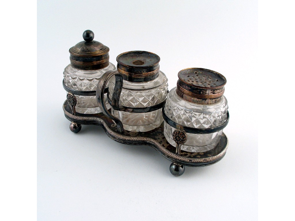 An old Sheffield plated three bottle inkstand on ball feet , with cut glass receners, c.1805, 7in (18cm).