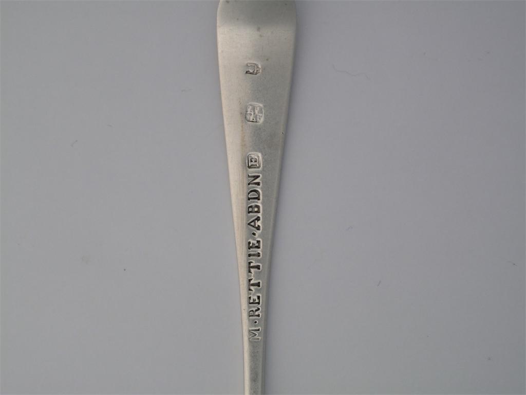 MIDDLETON RETTIE: (retailled by), maker JAMES ERSKINE, and Old English dessert spoon, script initials M over ER, c.1815, 0.75oz. A rare example of the two marks in overall nice condition. (7/10)