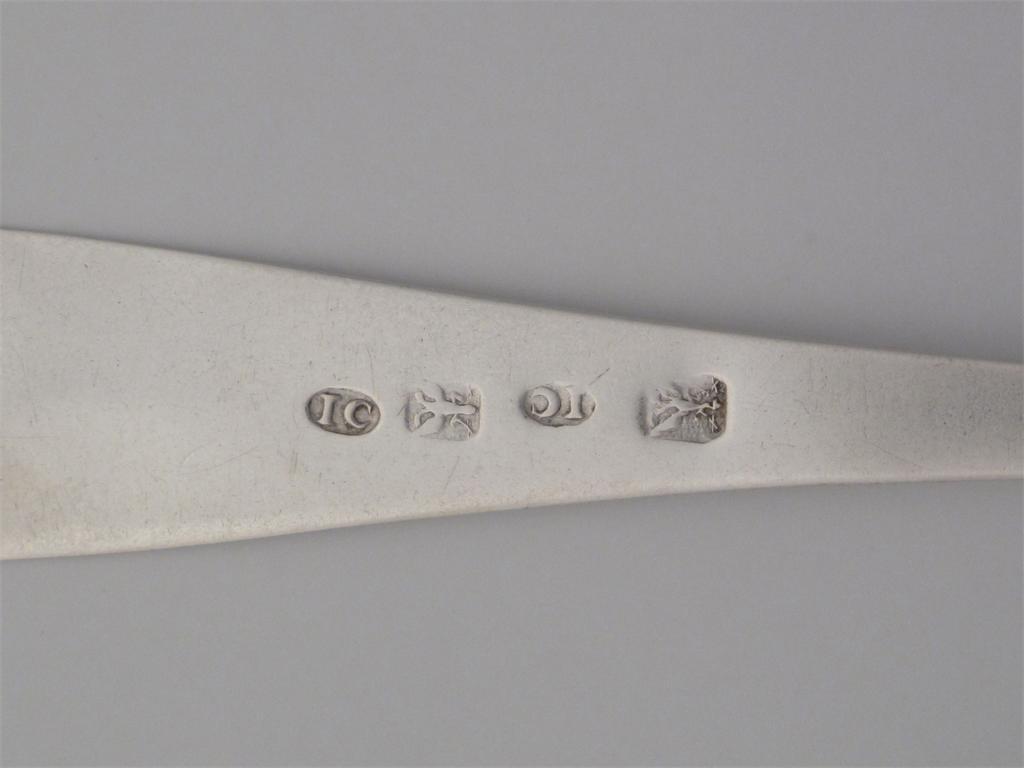 JAMES CORNFUTE: A pointed end tablespoon, c.1780, 0.75oz. Erasured and polished bright, bowl a little thin, a light spoon with good marks. (61/2/10)