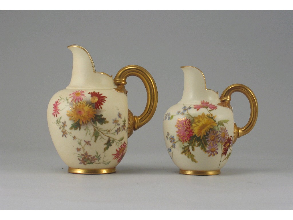 Two Royal Worcester flat-back jugs, decorated with flowers, c.1896 and 1903, 13cm. & 11cm. (2)