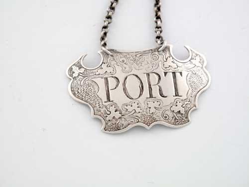 A George II escutcheon wine label, with a chased vine border, incised 'PORT', by Sandilands Drinkwater, London c.1740 (makers mark and lion passant only).