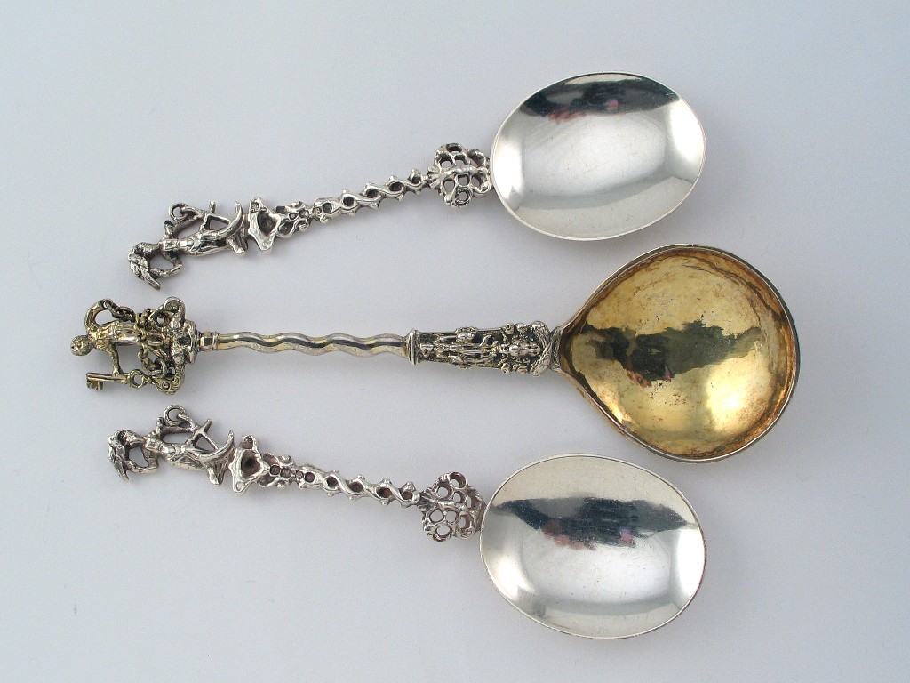 A 17th century Dutch silver gilt spoon , with a wriggly stem and a cast finial depicting the angel holding the Key of Inferno while a dragon descends into a pit (revelations 20: 1-3) probably by Jan Palenstein, Enkhuizen, second half of the 17th century (date letter E), together with a pair of Victorian cast spoons, replicating Dutch examples, with `hope' finials, by J. Rosenthal & S. Jacob, London 1886, the first spoon 7.75in (19.5cm) 5.5oz.