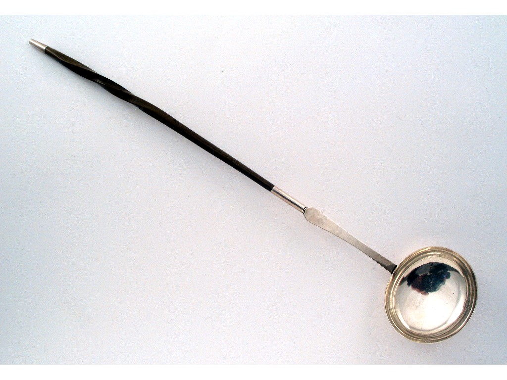 A George III Scottish punch ladle , with a twisted whalebone handle, maker's mark `RK' possibly by Robert Keay, with Edinburgh marks for c.1795, 15.4in (39.2cm).