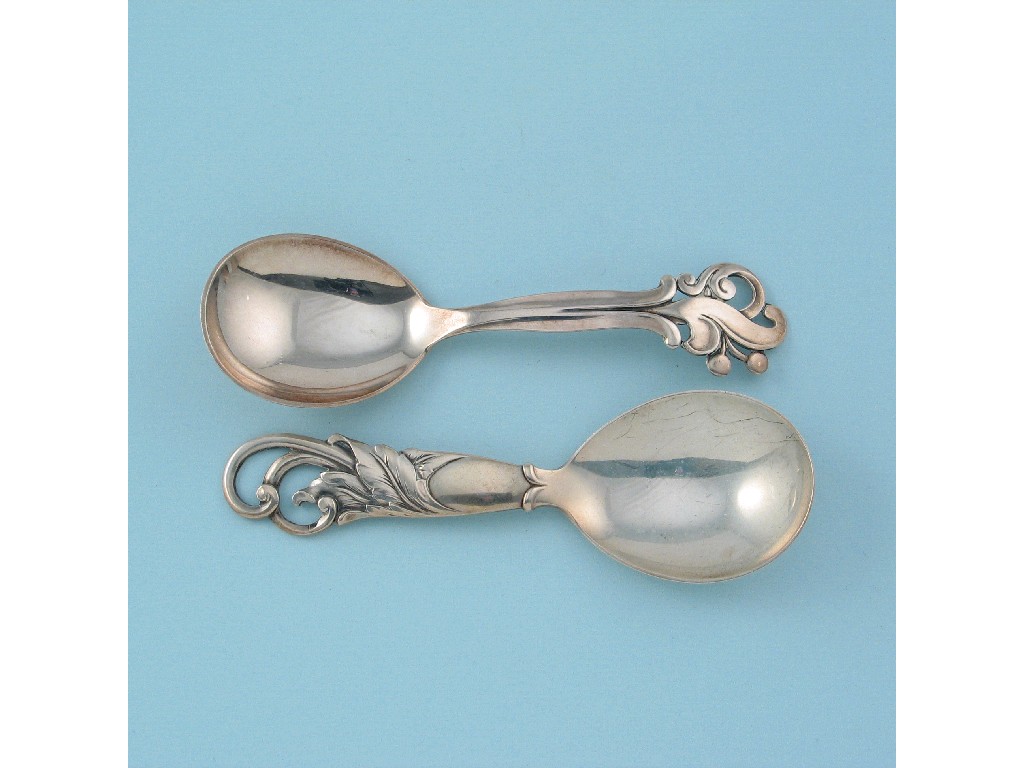 Two modern Danish caddy spoons , with openwork scroll terminals. (2)