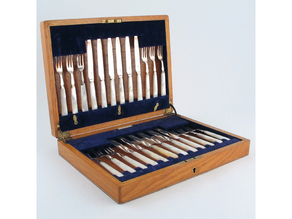 An Edwardian cased set of twelve pairs of plated fruit knives and forks , with mother of pearl handles with a registered design No for 1903/04.