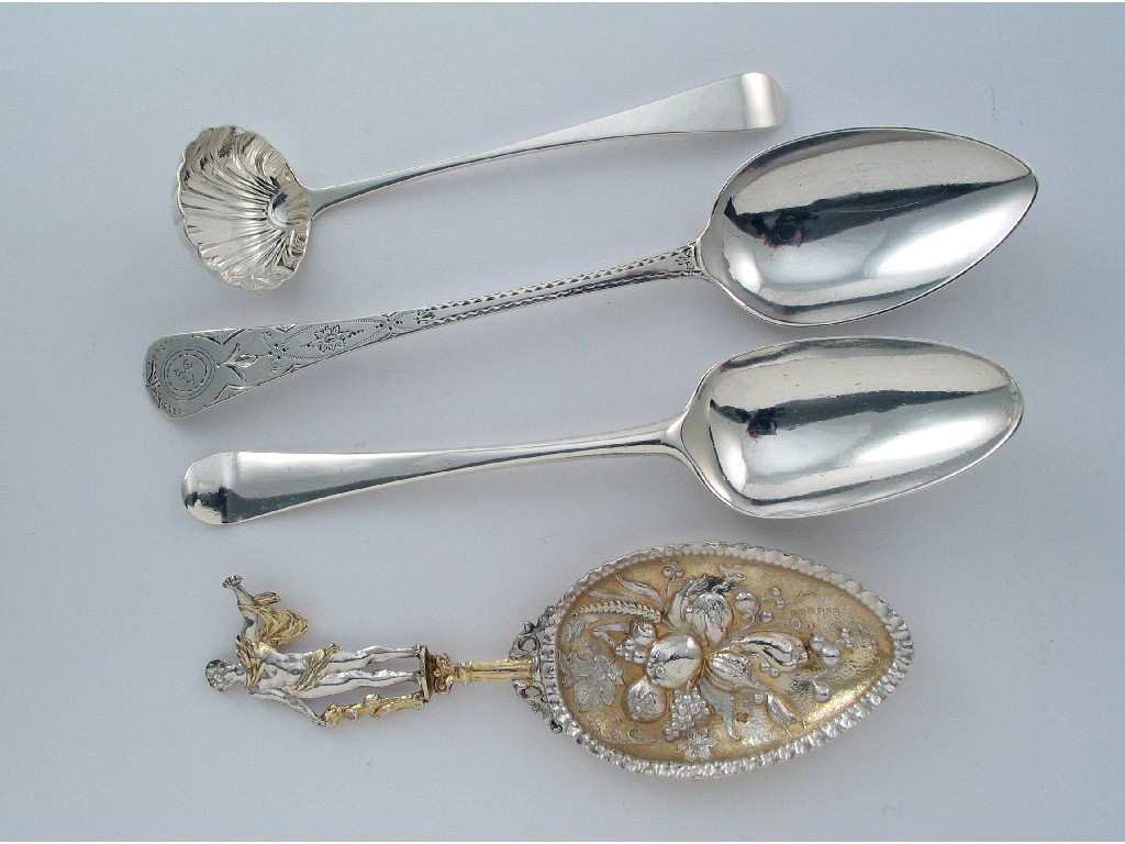 A mixed lot including : a George III bright cut tablespoon, by Peter & Anne Bateman, a George III Hanoverian pattern tablespoon, a Victorian sauce ladle with shell shaped bowl and a Dutch parcel gilt spoon, with import marks for B???? Muller, Chester 1897, 7oz. (4)