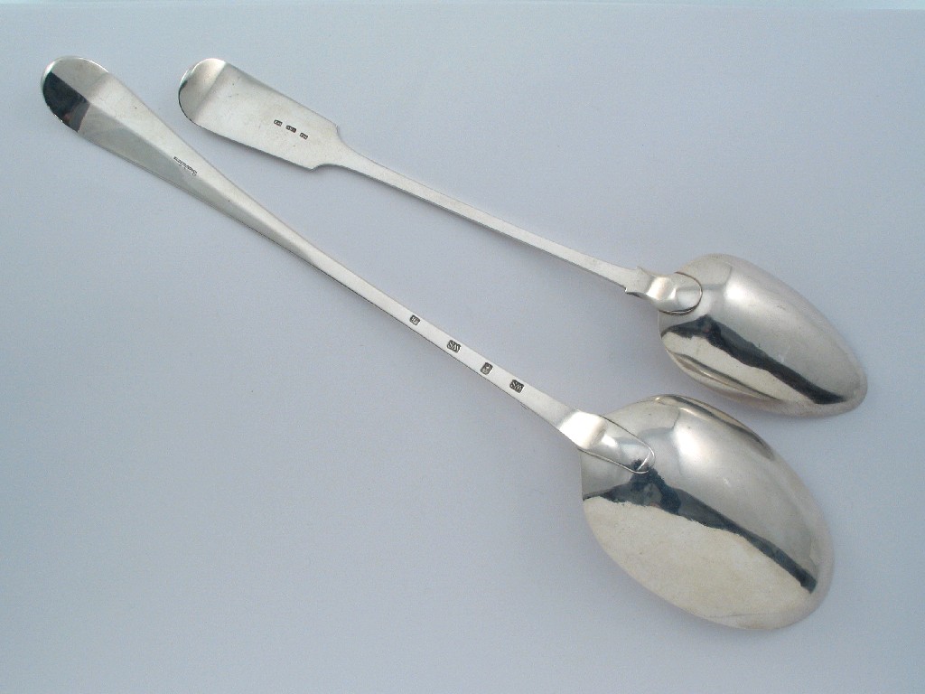 A George III Scottish provincial basting or ??? spoon , initialled `RJW', by William Scott, Dundee (WS, pot of lilies, WS, W) c.1785, 14.9in (37.8cm), 6oz.Provenance: Ex Margins of Breadalbane Collection (stamped with incuse facsimile signature).