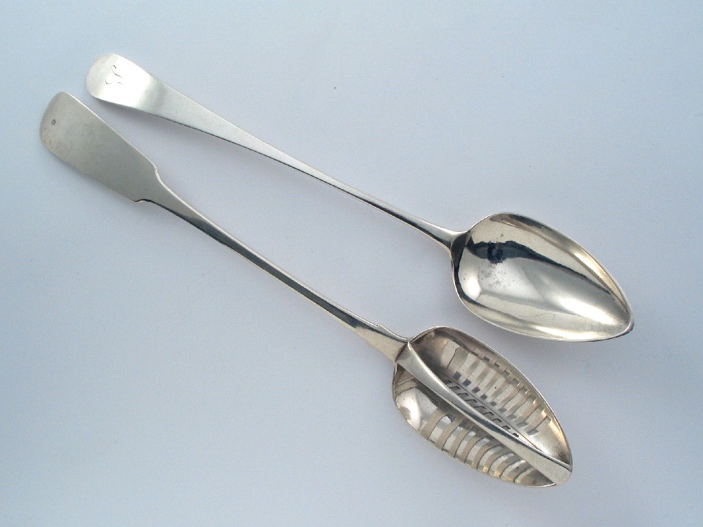 A George III Scottish serving spoon , Old English pattern, initialled, maker's mark R.W. (possibly for Robert Wilson) Edinburgh 1798, 12in (30.5cm), 3.5oz.