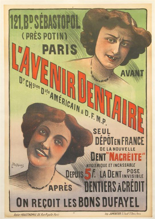 'L'Avenir Dentaire' a lithographic poster by L Pousthoumis, published by Imp. Jumentier, Paris, mounted on linen, framed, 35.25 x 24.5 inches (90 x 62 cm.)