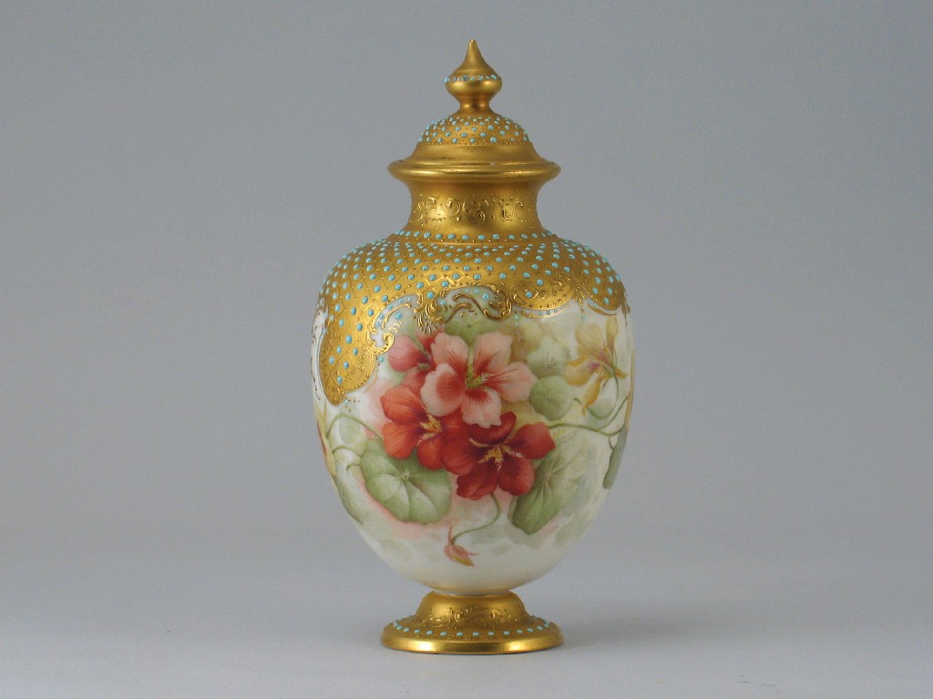 A jewelled porcelain vase and cover, painted with nasturtium and inscribed 'L.J.H '96'. A few jewels lacking from the finial. c.1896, 19.5cm. (2)