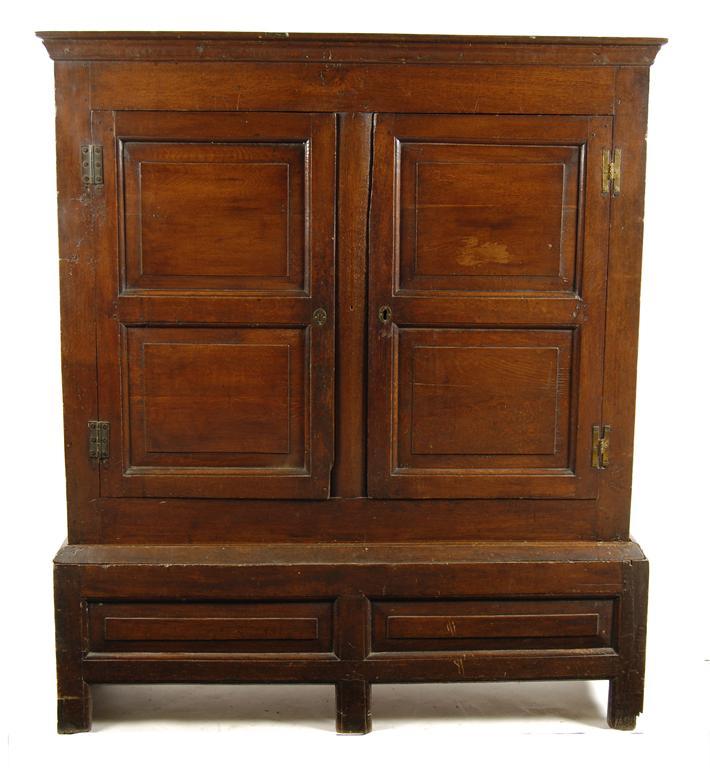 An oak press cupboard, the moulded cornice above a pair of panelled doors enclosing hanging space with pegs, 18th century and later, 66in (168cm) h, 57in (144.7cm) w, 20.75in (52.3cm) d.