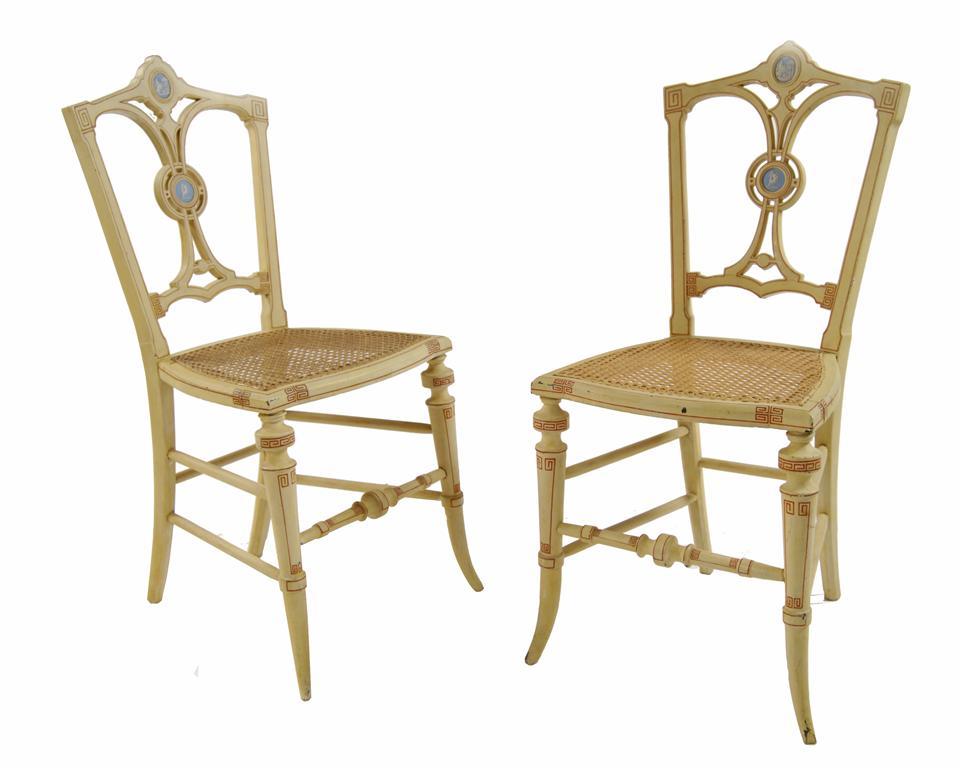 A pair of Victorian painted side chairs, by Bettridge & Co, the open backs with inset wedgewood style cameos, with caned seats, the undersides with brass labels 'FOR BETTRIDGE & CO, MAKERS, BIRMINGHAM'. (2)