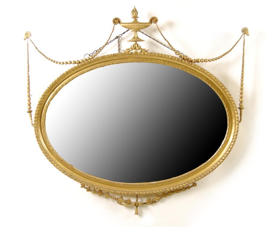 A late Victorian giltwood and gesso oval wall mirror, having a bevelled plate and gadroon edge, with a flaming urn surmount issuing beads with rams head terminals, the base with laurel swag, 34 x 34.5in (86.3 x 87.6cm). Repairs to some beads.