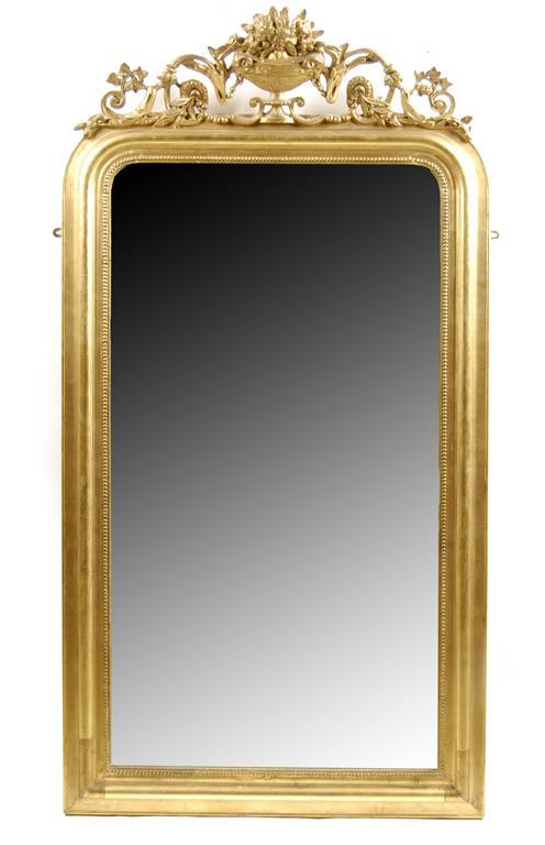 A 19th century giltwood mirror, the rectangular plate to a beaded and moulded frame, with a floral urn surmount, 61.75 x 32.75in (156.6 x 83cm). Restoration.
