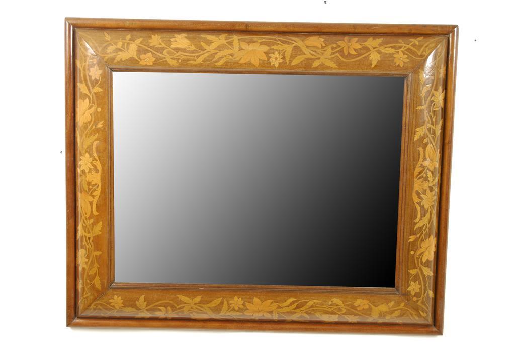 A late 19th century mahogany and floral marquetry cushion frame mirror, with a rectangular plate, 26.25 x 32.5in (66.5 x 85.5cm).