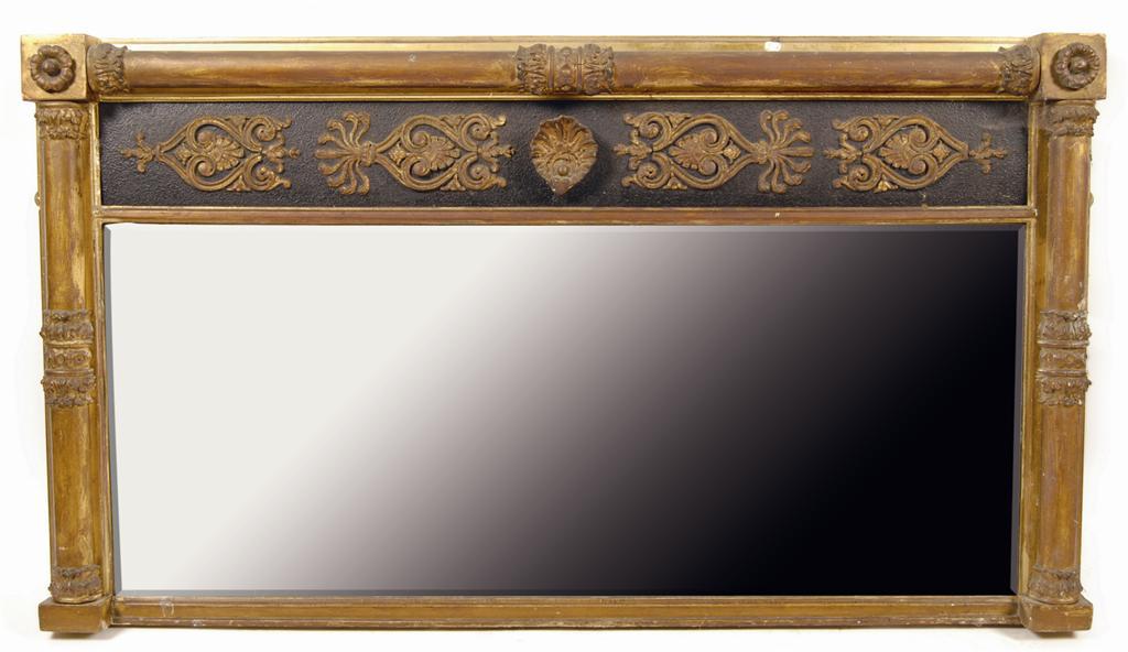 A giltwood and gesso overmantel mirror, the leaf and baton carved frame to an ebonised frieze centred a shell, above a bevelled rectangular plate, 27in (69cm) h, 48.5in (123.2cm) w.