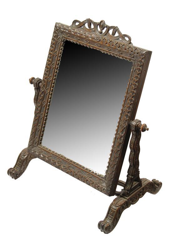 A Victorian carved oak swing frame toilet mirror, with a rectangular bevelled plate to a floret and stiff leaf border, with a ribbon surmount, on shaped open supports with a pierced stretcher on scroll legs, 27.5in (70cm) h, 23in (58.5cm) w.