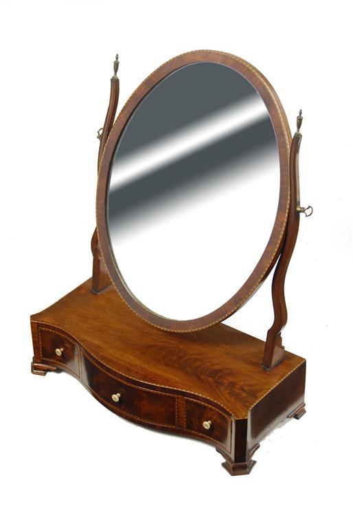 A George III mahogany dressing table mirror, inlaid chequer stringing, the serpentine box base fitted three drawers on bracket feet, 23.5in (59.5cm) h, 18.5in (47cm) w, 9.25in (23.5cm) d. Restored with replacements.