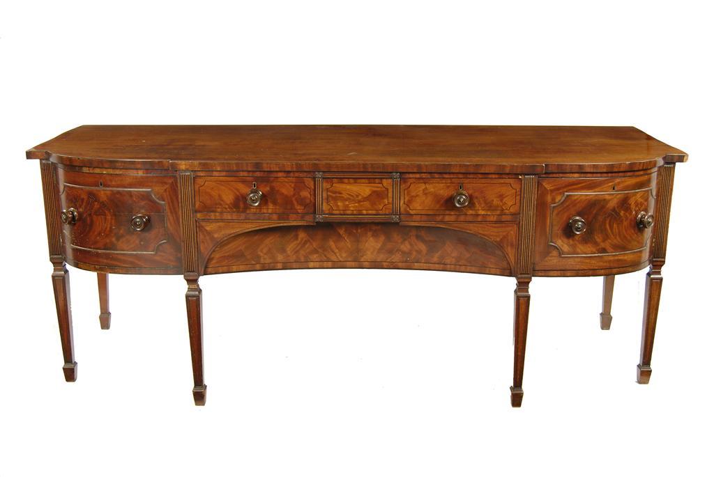 A large Regency mahogany barrel front sideboard, inlaid ebony stringing with two frieze drawers, one with a dummy front above a concave drawer, flanked by two cupboard doors, with reeded decoration and on panelled square tapering legs to spade feet, possibly Scottish 36.25in (92cm) h, 93.75in (238cm) w, 34.75in (88.3cm) d. Cracks to top and drawers, veneer loss, one leg off but present.