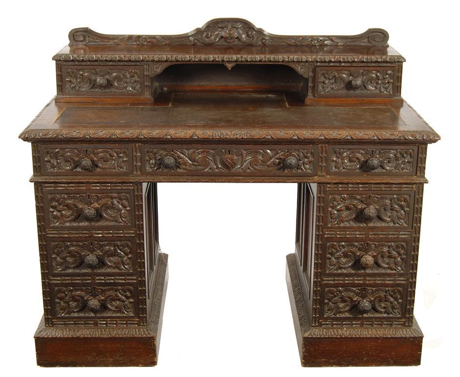 A Victorian carved oak twin pedestal desk, with a raised back, the central drawer stamped 'EDWARDS & ROBERTS', 40.25in (102cm) h, 48in (121.6cm) w, 25.75in (65.2cm) d. Veneer lifting to back of plinth base.