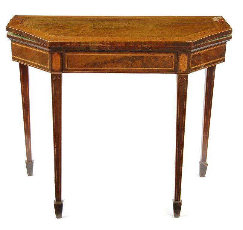 A George III mahogany and satinwood banded card table, of canted form, the conforming frieze on square tapering legs to spade feet, 29.25in (74cm) h, 34.75in (88cm) w, 16.75in (42.6cm) d. Veneer loss, crack to top, damages.