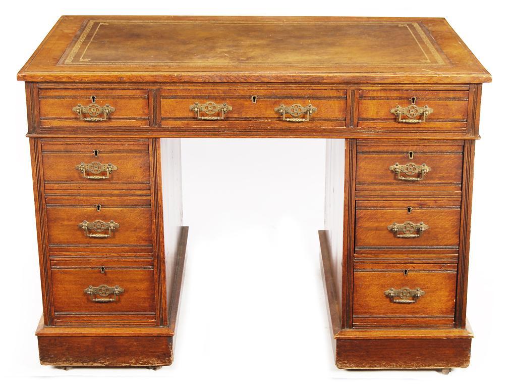 A late Victorian oak small pedestal desk, the top inset a later gilt tooled leather, above three frieze drawers the central one with stencil stamp 'From S & H Jewells, Furniture Warehouses 29, 30 & 31 Little Queen Street Holborn', above three drawers to each pedestal all fitted brass handles, the back pedestals with rectangular panels, the plinths on iron castors, 30in (76cm) h, 42in (107cm) w, 26.75in (67.5cm) d.