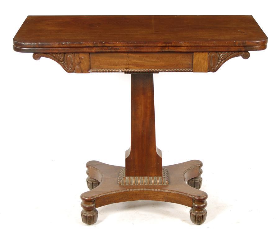 A William IV mahogany tea table, with nulled decoration, the quatreform base on lobed feet and sunken brass castors, 29.25in (74.2cm) h, 35.75in (90.6cm) w, 17.75in (45.1cm) d. Hinges broken, top now loose.