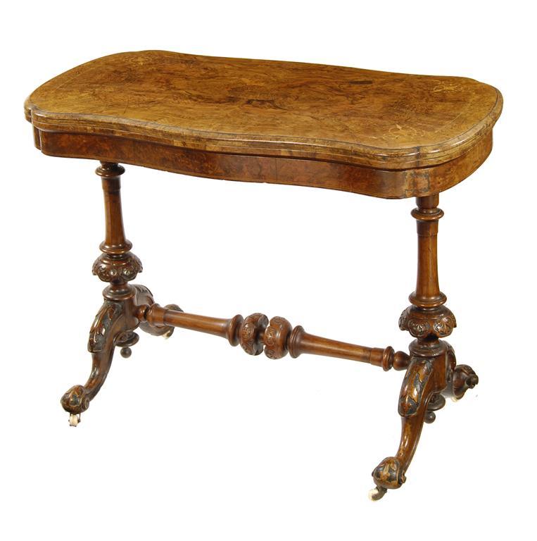 A Victorian walnut and marquetry card table, the serpentine burr veneered hinged and swivel top with a baize lined playing surface, on turned and carved stretchered supports, on ceramic castors, 28.25in (71.7cm) h, 38in (96.5cm) w, 20in (51cm) d. Old breaks, restorations and replacements.