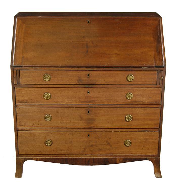 A 19th century mahogany bureau, the fall flap enclosing pigeon holes and bird's eye maple veneered drawers, above four long graduated drawers and swept bracket feet, 42in (107cm) h, 40in (101.5cm) w, 20.75in (52.5cm) d. Back leg off but present, old damages, replacements.