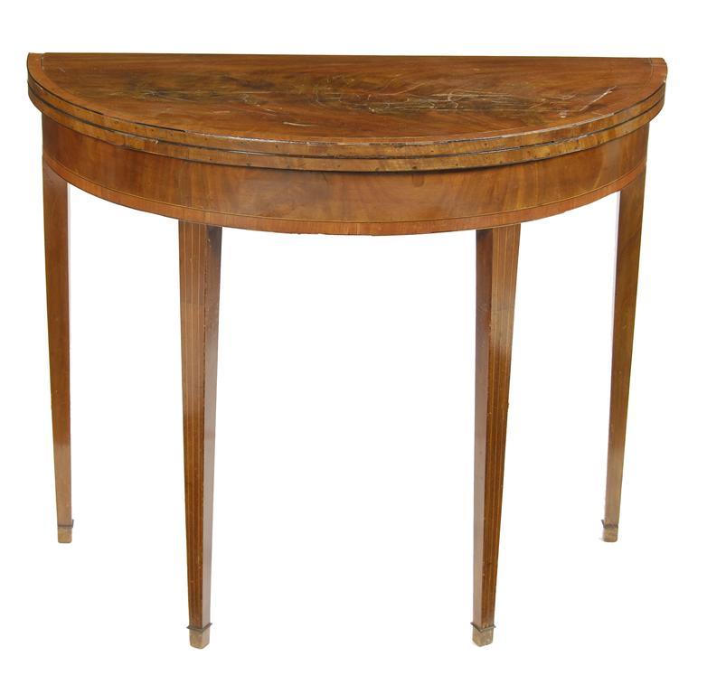 A mahogany demi lune card table, with satinwood banding, on square tapering legs, George III and later, 24.25in (73.9cm) h, 36in (91.2cm) w, 18in (46cm) d. Front legs spliced, back legs possibly replaced, cracks to top and a patch.