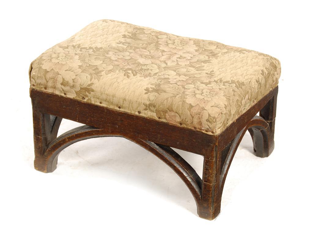 A Victorian oak foot stool, in Gothic style, 9in (22.8cm) h, 16.26in (41.1cm) w, 12.25in (30.9cm) d. Repairs.