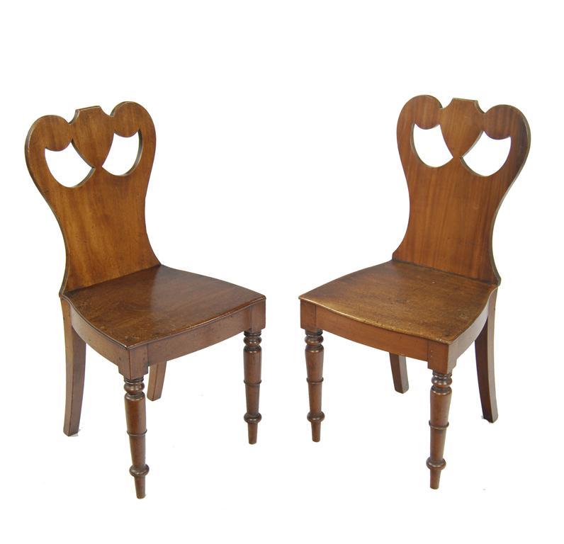 A pair of Victorian mahogany hall chairs, the waisted and pierced backs centred a vacant shield to solid bell front seats on turned tapering legs. (2)