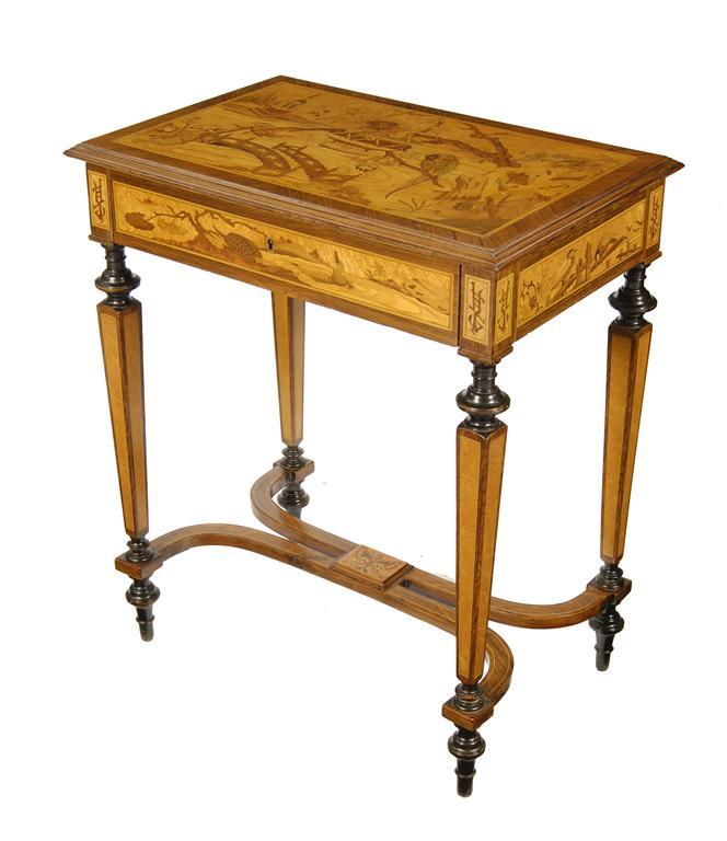 A late 19th century Dutch rosewood and marquetry dressing table, the moulded edge hinged top inlaid a chinoiserie scene with a temple, a basket of flowers and birds in a tree, above a compartmented interior and a bevelled mirror inset into the lid, the frieze with marquetry panels on square tapering legs united by an 'X' stretcher, 30in (76.2cm) h, 25.5in (64.8cm) w, 16.75in (42.4cm) d. Restoration.