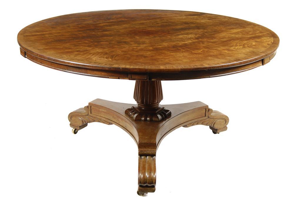 A George IV mahogany breakfast table, the circular crossbanded tilt-top above a frieze with applied tablets, on a reeded stem and panelled triform base to carved scroll feet and brass castors, 27.25in (69.3cm) h, 53.75in (136.3cm) dia. One bearer replaced, stem possibly replaced.