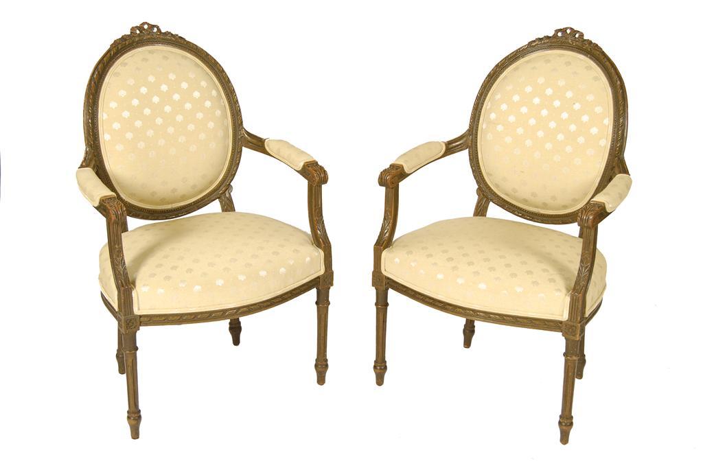 A pair of French carved and painted wood fauteuil, with oval backs padded arms and bowfront seats, early 20th century. (2)