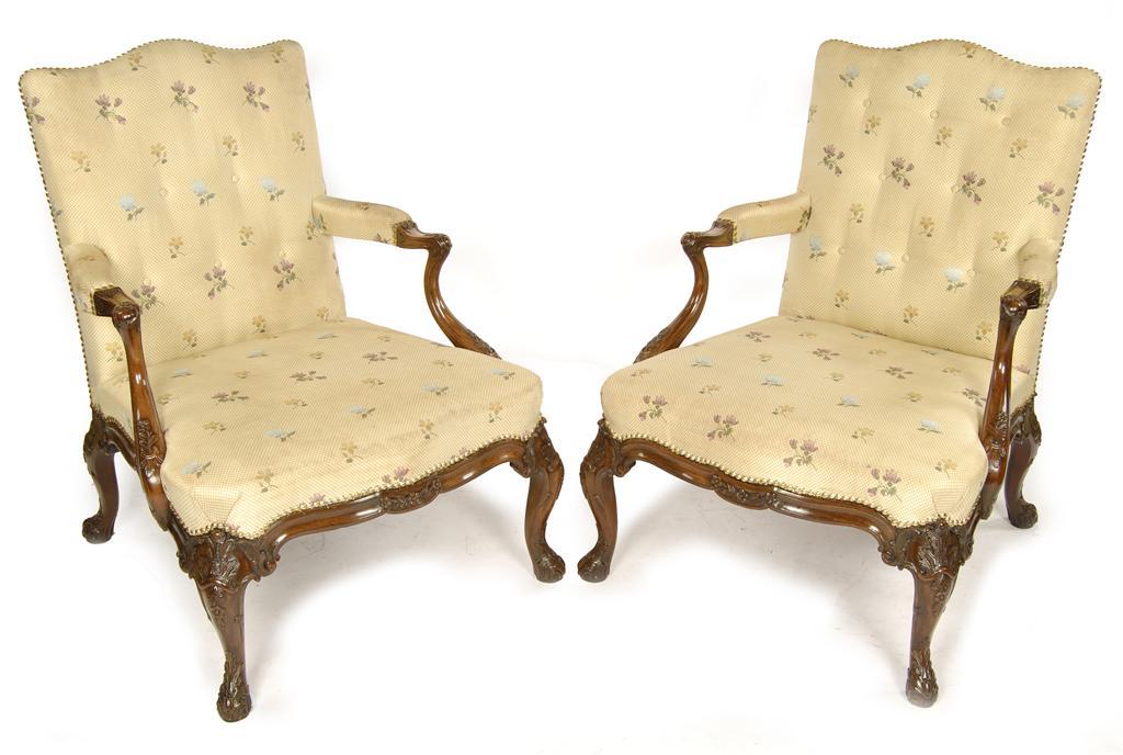 A pair of library armchairs in early George III style, the button upholstered backs and padded arms to mahogany carved supports to a serpentine front seat with a chanelled apron with foliage carving on leaf carved cabriole legs to leaf pad feet. (2) Modern.