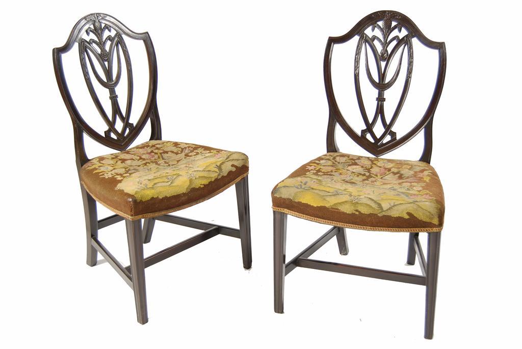 A pair of late 19th century mahogany armchairs in late 18th century style, the shield shaped backs with pierced and carved splats with leaves issuing pineapple, the dished needlework seats decorated birds and foliage, on square tapering moulded legs united by an 'H' stretcher. (2)