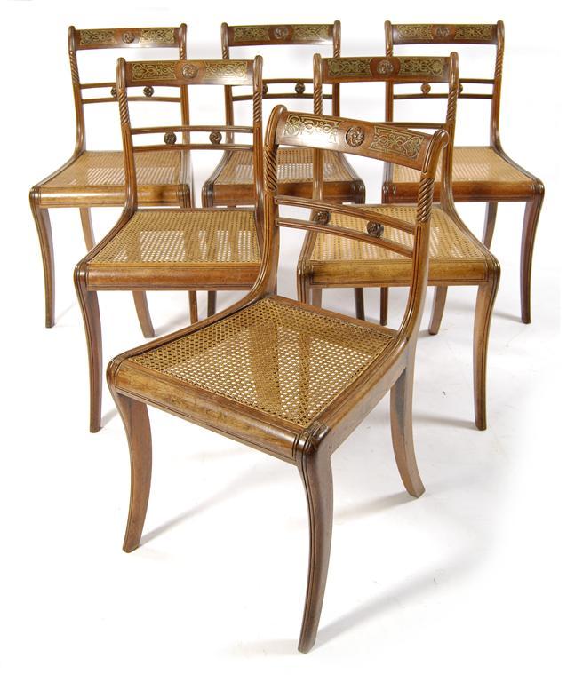 A matched set of six late Regency rosewood side chairs, with brass marquetry to the top rails and carved floret decoration having cane seats on sabre legs. (6)