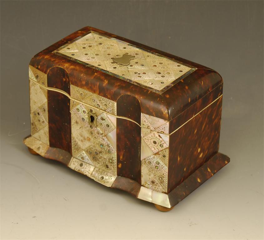 An early Victorian tortoiseshell and engraved mother of pearl panelled tea caddy, with abalone inlay and the top with an applied vacant shield, to a breakfront, the twin lidded interior with remains of foil lining on turned vegetable ivory bun feet, 5in (12.5cm) h, 8in (20.3cm) w, 4.5in (11.5cm) d. Hinges loose, some mother of pearl segments missing, minor chips, lids warped, one handle missing.