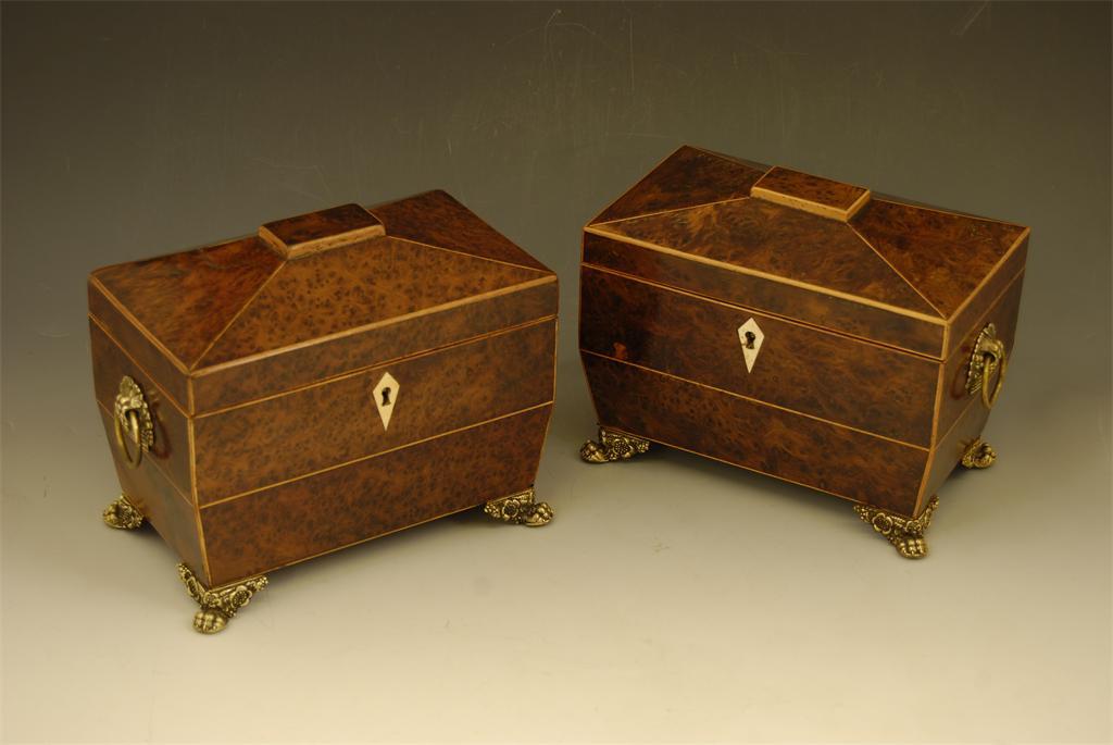 A pair of Regency burr yew veneered sarcophagus shape tea caddies, with boxwood stringing, the hinged covers revealing twin-lidded interiors, embossed basket plate ring side handles, on paw feet, 6.25in (16cm) h, 7.5in (19cm) w, 4.5in (11.5cm) d. (2) Restoration.