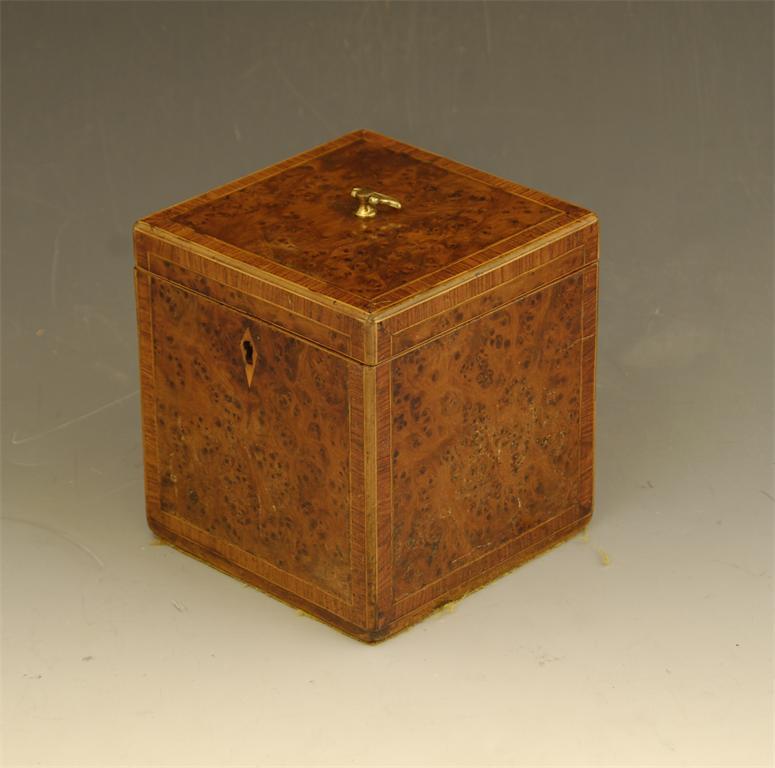A late George III burr yew wood cube tea caddy, with stringing and rosewood banding, the interior with a later lined lidded compartment, 5in (12.7cm) h, 4.5in (11.5cm) w and d.