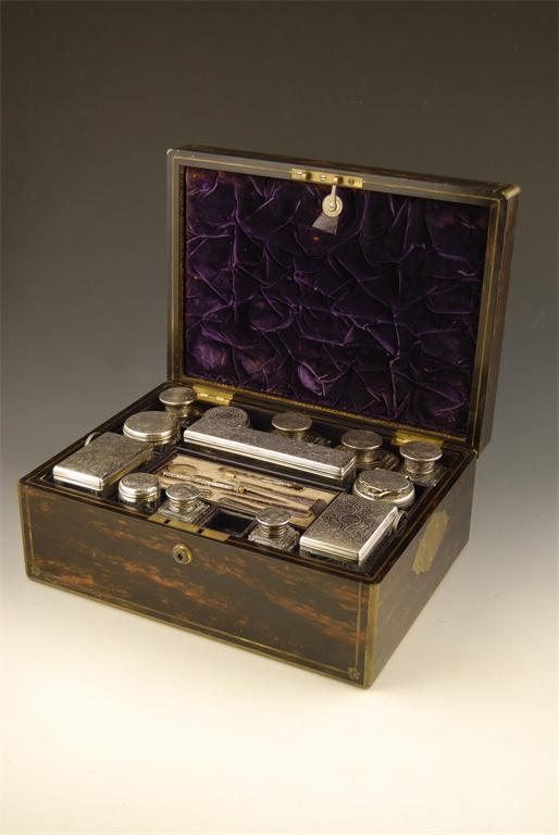 A Victorian macasser ebony travelling toilet box, with brass banding and sunken carrying handles, the hinged cover with plush lined wallet, mirror missing, fitted cut glass bottles and jars with engraved silver covers, maker J.H., London 1853, each with an armorial and motto 'TO MNIEY BOLI', with a lift out tray and another for accoutrements, parts missing, the brass lock stamped 'J BRAMAH, 124 PICCADILLY'. 6.25in (16cm) h, 14.25in (36.5cm) w, 10.5in (26.7cm) d.