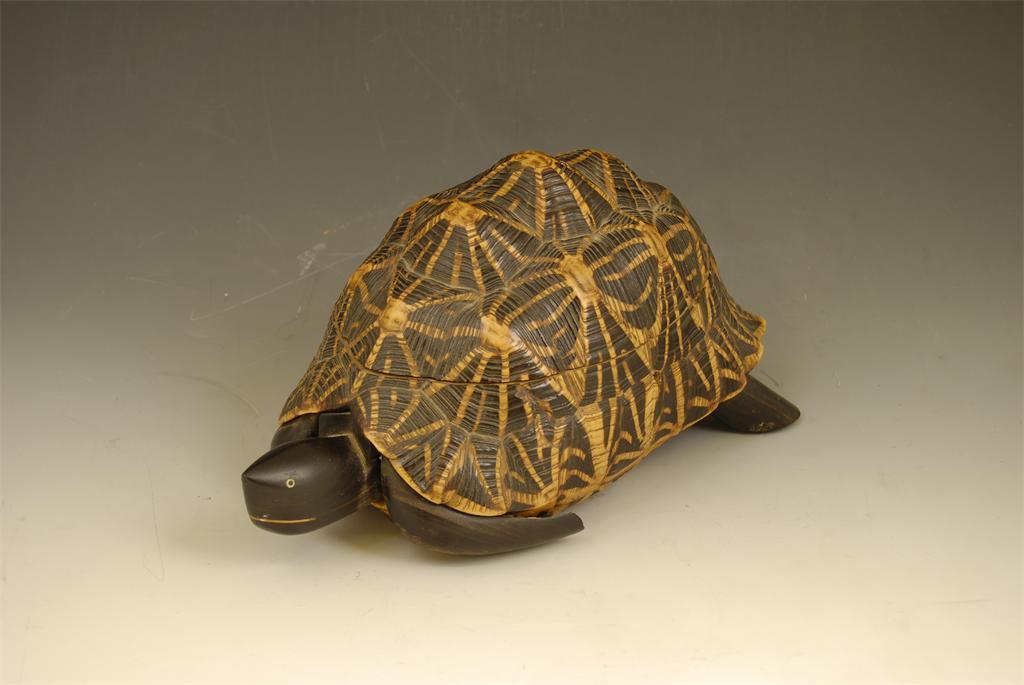 An Anglo-Indian tortoise tea caddy, modelled using the whole shell with ebony head and legs, the hinged cover with a parquetry inlaid top and a lidded compartment with a brass lock, 6in (15cm) h, 11.5in (29cm) l.