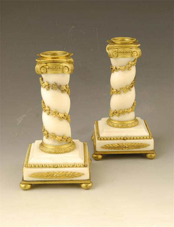 A pair of 19th century French white marble and ormolu mounted candlesticks, with detachable nozzles, the bases numbered '10572', 6.5in (16.5cm) h. (2) Breaks, losses and repairs to the entwined ivy.