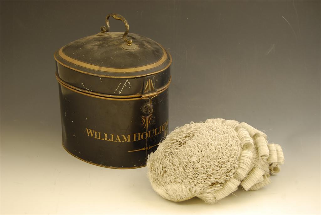 A wig by Ravenscroft, 'Law wig and robe maker, Lincolns Inn, London.', in a shaped tin box, inscribed with the owners name 'William Holding Esqre.', the box with a lacquered gilt brass carrying handle.