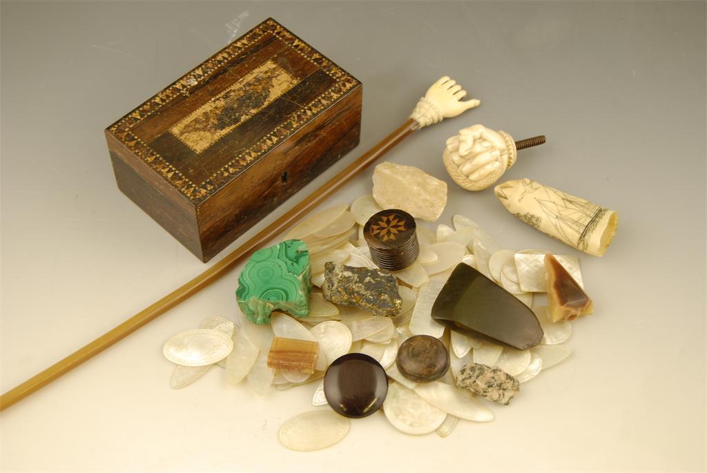 A 19th century horn and carved ivory back scratcher, 18in (45.7cm) l. repairs, a carved ivory clenched fist with snake, a scrimshaw decorated tooth with twin masted ship, dove and a sailor leaving his home, a small quantity of Chinese engraved mother of pearl counters, a Tunbridge ware box, and various stone samples. (a lot)