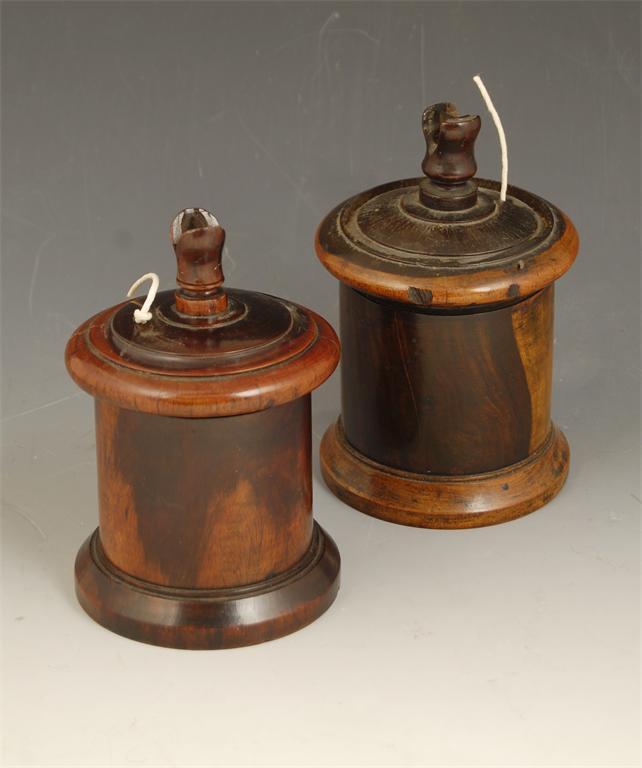 A 19th century turned lignum vitae string box, the screw-off cover with a shaped cutter with later nut fixing, 6.25in (16cm) h, and another similar. (2)