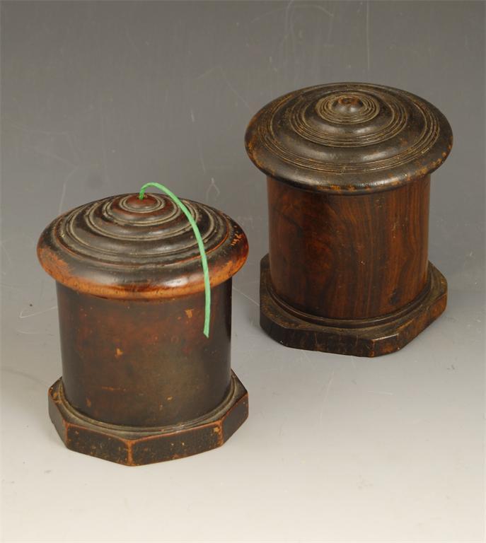A 19th century turned lignum vitae string box, with a reeded band screw-off cover with a pierced aperture, on a pentagonal base, 5in (12.6cm) h, and another similar string box. (2)